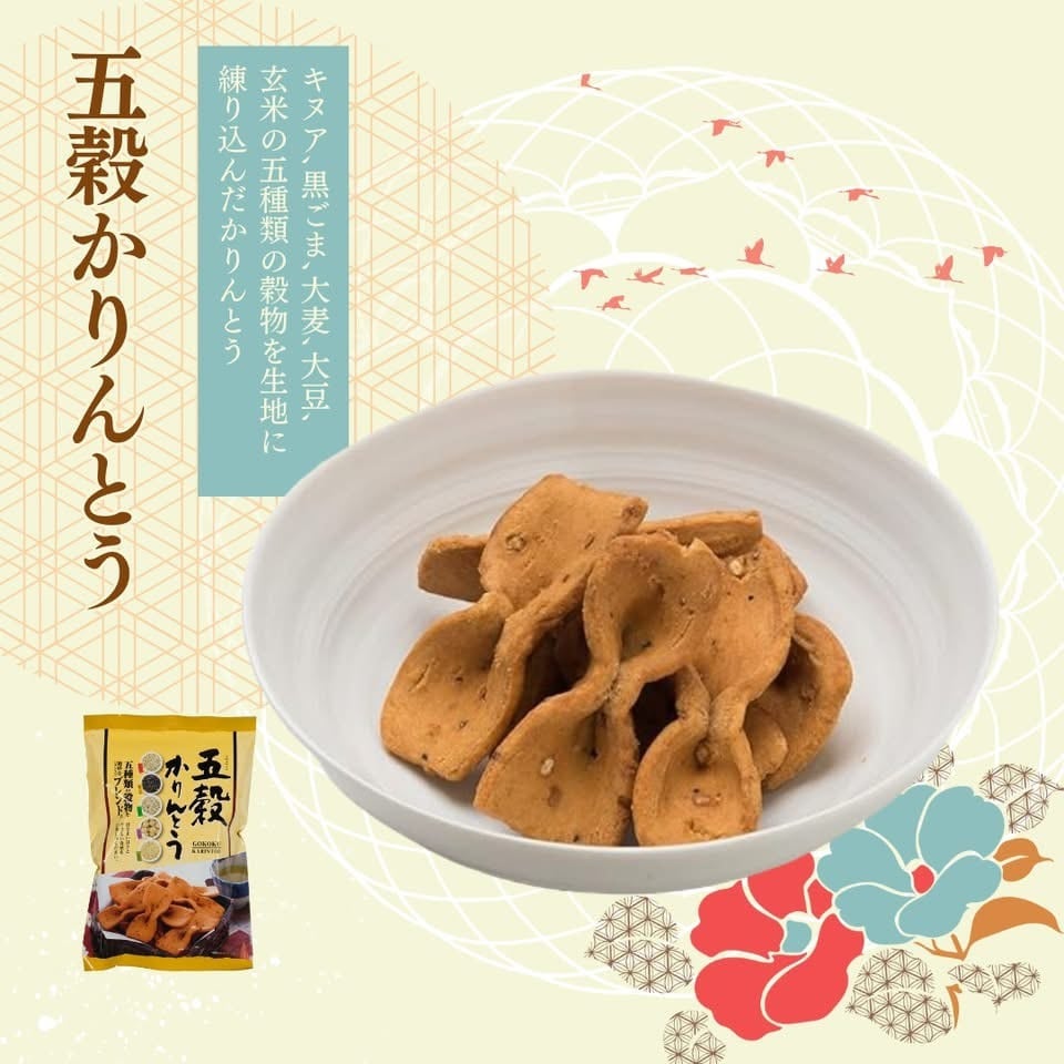 キヌア、黒ごま、大麦、大豆、玄米の五種類の穀物を生地に練り込んだかりんとうです。
