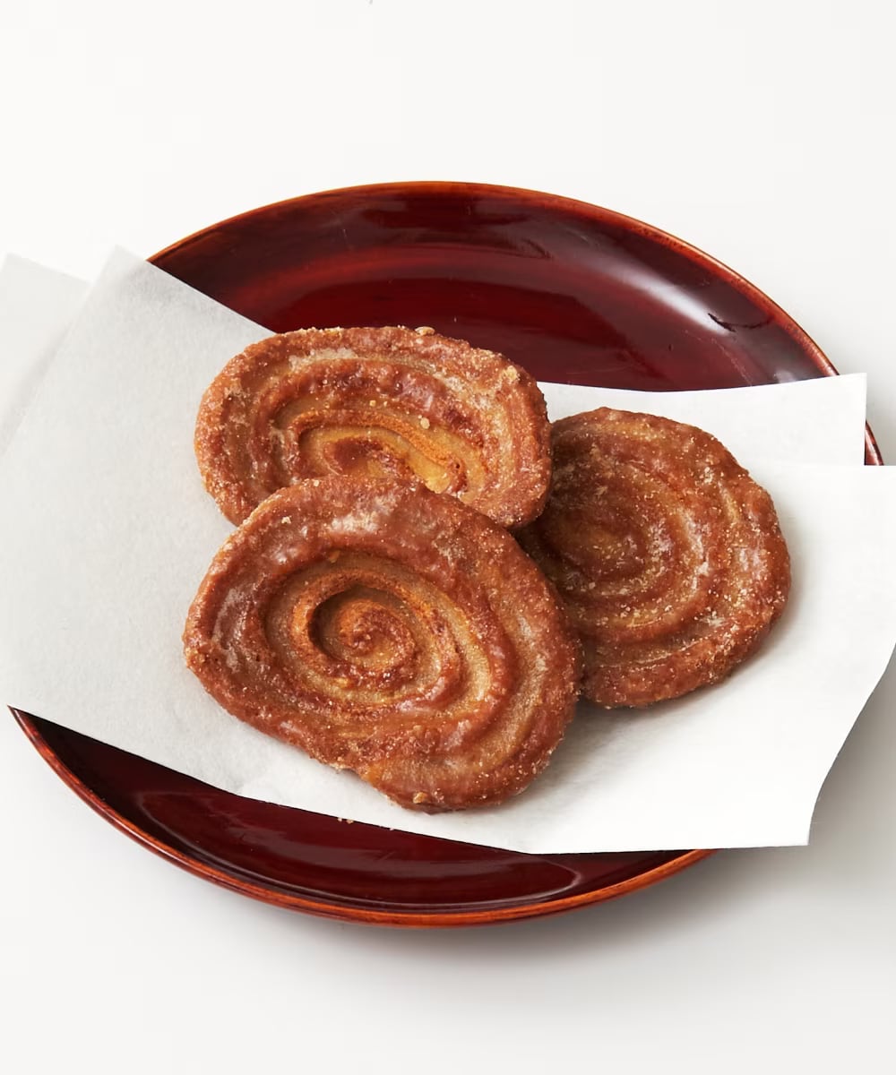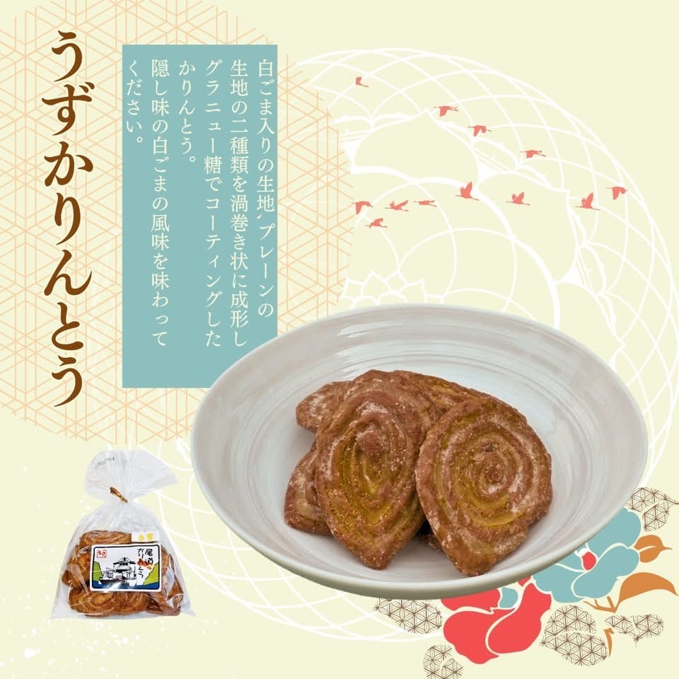 白ごま入りの生地、プレーンの生地の2種類を渦巻き状に成形し、グラニュー糖でコーティングしたかりんとうです